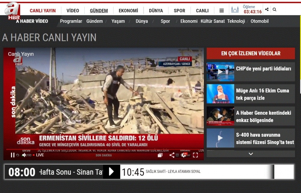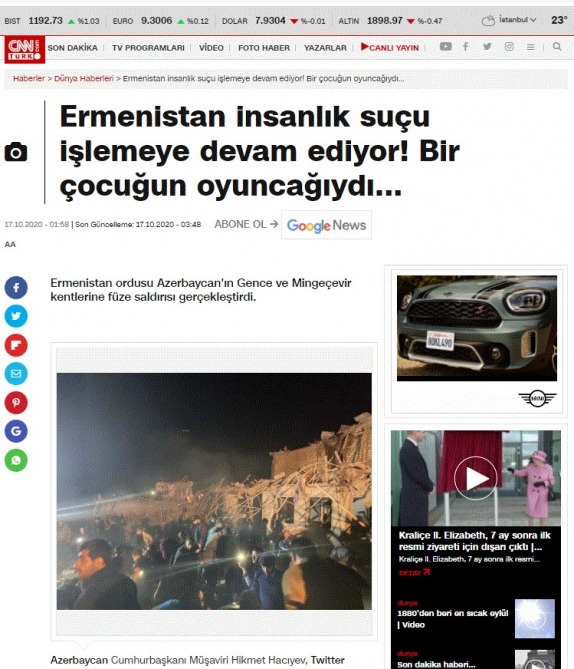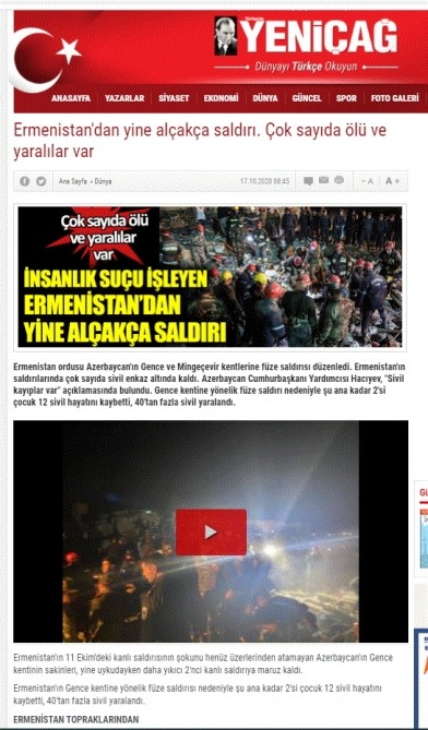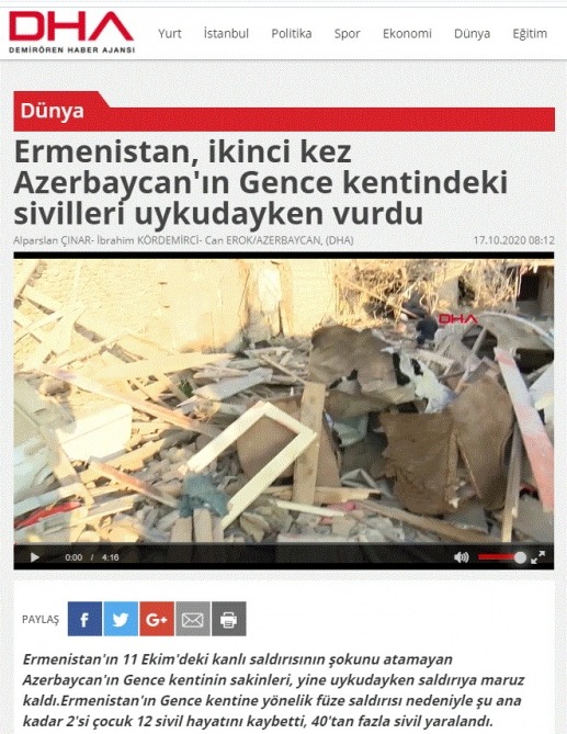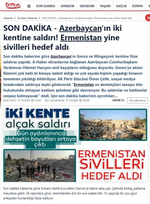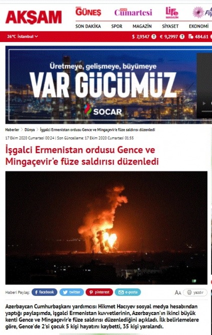 Türkiyə kütləvi informasiya vasitələri (KİV) Ermənistan silahlı qüvvələrinin oktyabrın 17-də gecə saatlarında Gəncə və Mingəçevir şəhərlərinə raket zərbəsi endirməsi barədə məlumatları fasiləsiz olaraq yaymaqda davam edir.