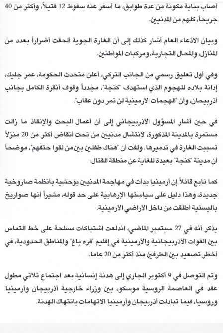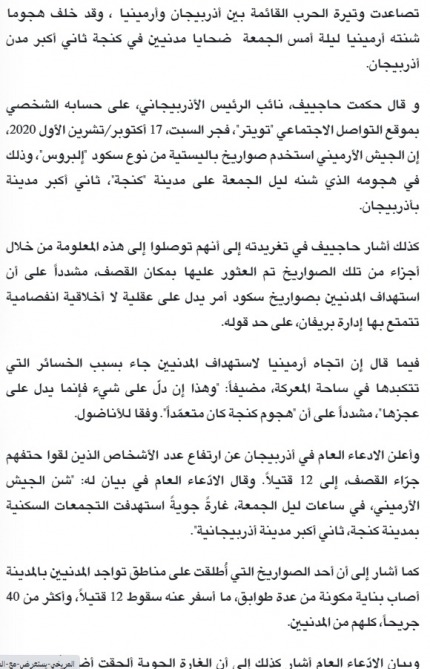 Qətərin ərəb dilində nəşr olunan və ölkədə ərəb dilli qəzetlər arasında ən geniş oxucu kütləsinə malik “Əl-Şərq” qəzetində Ermənistanın oktyabrın 17-də Gəncə şəhərinin mülki əhalisini ballistik raket atəşinə tutması ilə bağlı yazı dərc olunub.