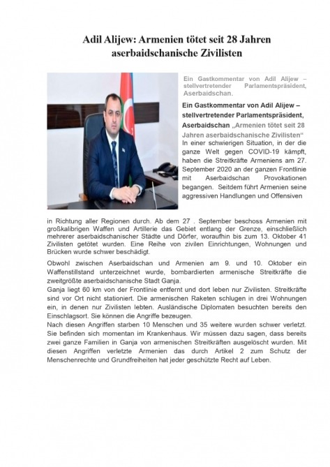 Milli Məclisin Sədr müavini Adil Əliyevin mülki Azərbaycan əhalisinin Ermənistan silahlı qüvvələri tərəfindən qətlə yetirilməsi barədə məqaləsi Almaniya mətbuatında işıq üzü görüb.