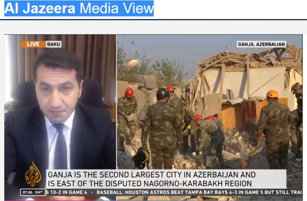 Azərbaycan Respublikası Prezidentinin köməkçisi - Prezident Administrasiyasının Xarici siyasət məsələləri şöbəsinin müdiri Hikmət Hacıyev Ermənistanın son təxribatları, xüsusilə Gəncə şəhərinə raket hücumu ilə bağlı “Al Jazeera” televiziya kanalına müsahibə verib.