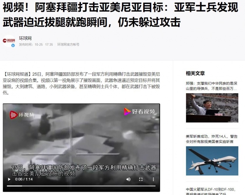 Çin Mərkəzi Televiziyasının (CCTV) mövzuya dair reportajında Azərbaycanın Müdafiə Nazirliyinin düşmən hədəflərinin məhv edilməsinə dair görüntüləri yayımlanıb.