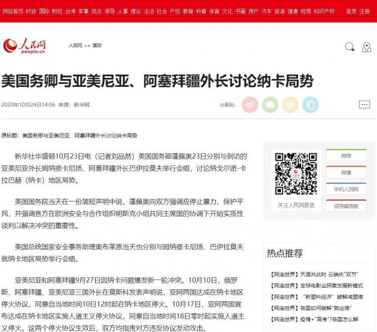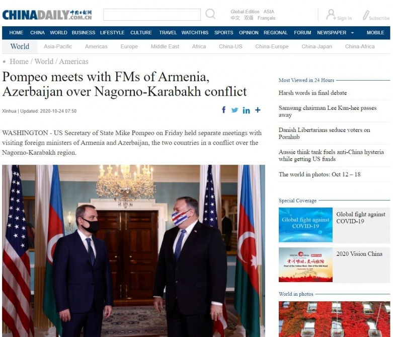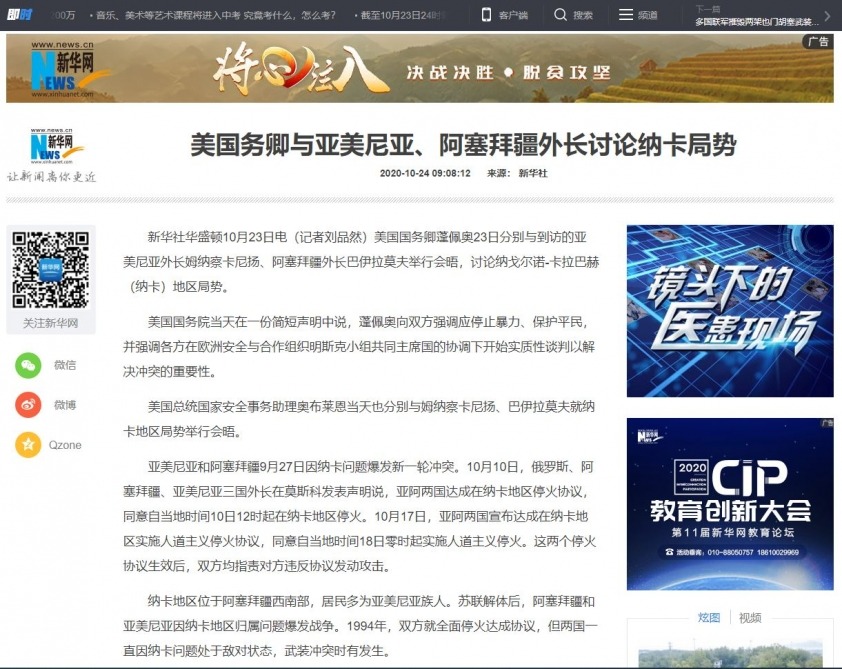 Çinin kütləvi informasiya vasitələri Ermənistanın təxribatları və Azərbaycan Ordusunun əks həmlə əməliyyatı barədə materialların təqdimatını davam etdirir.
