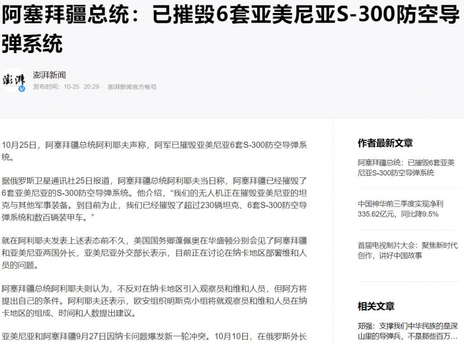 Çinin digər xəbər portallarındakı mövzuya dair xəbərlərdə Azərbaycan Ordusunun düşmənin canlı qüvvəsini, döyüş texnikasını, o cümlədən S-300 tipli zenit-raket komplekslərini məhv etdiyi qeyd olunub. Azərbaycan Ordusunun döyüş əməliyyatlarında pilotsuz uçuş aparatlarını tətbiq etməsi Çin KİV-lərinin də diqqətini cəlb edib. Mövzuya dair xəbərlərdə qeyd olunur ki, Azərbaycan Ordusu PUA-lar və artilleriya vasitəsilə düşmənə ağır zərbələr endirib və müharibənin ritmini ələ alıb.