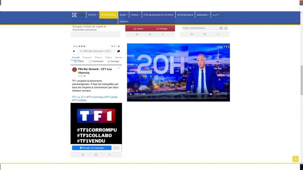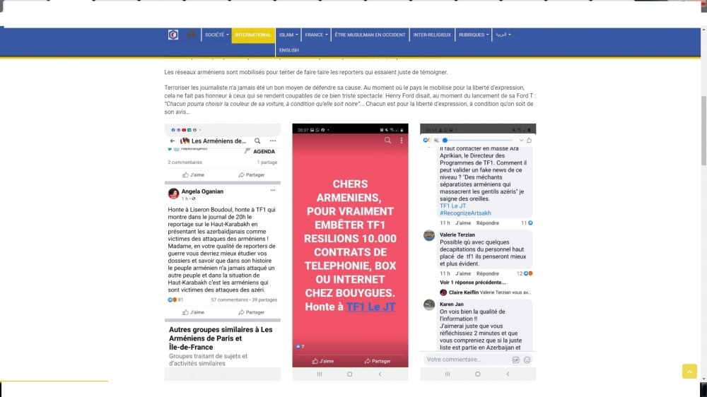 Erməni lobbisinin sosial şəbəkələrdə “TF1 kanalının yüksək vəzifəli işçilərinin bir neçəsinin başı kəsilsə onlar daha yaxşı düşünməyə başlayarlar” yazdığı hədələr məqalələrdə oxuculara təqdim olunub. Erməni lobbisinin həqiqəti deyən jurnalistləri susdurmaq üçün səfərbər olduğu diqqətə çatdırılıb.