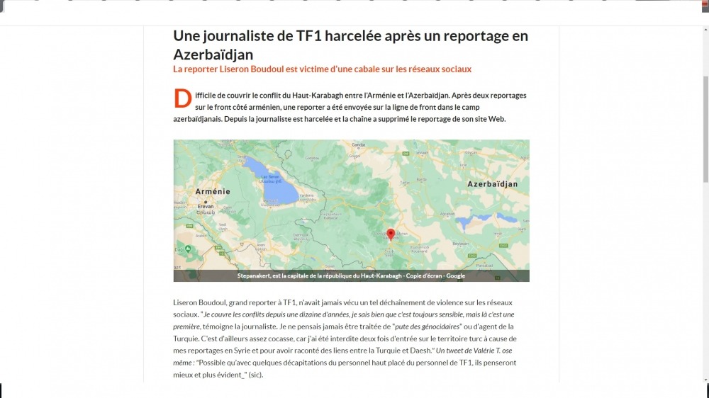 Bildirilib ki, TF1 televiziya kanalı Lizeron Budulun atəşkəs razılığından sonra Azərbaycanın Gəncə şəhərinin mülki əhalisinin Ermənistan tərəfindən raket atəşinə tutulması, nəticədə 27 mülki sakinin həlak olması və 140-dan çoxunun yaralanması, eləcə də 63 mülki infrastrukturun, 376 evin dağıdılmasına dair müharibə zonasından hazırladığı reportajını yayımlayıb. L.Budul müharibə sahəsində ixtisaslaşmış tanınmış reportyordur. Jurnalistlərin hazırladığı reportaj qəbul edilib və ya edilməsə də, bəyənilib və ya bəyənilməsə də, öz maraqlarına görə jurnalisti hədələmək və sosial şəbəkələrdə təhqir etmək heç vaxt yaxşı vasitə olmayıb və olmayacaq. Fransada jurnalistləri susdurmaq olmur, onları hədələməklə qorxuda bilməzsiniz. Söz azadlığından danışan bir ölkədə erməni lobbisinin məhz söz azadlığını boğması qəbuledilməzdir.