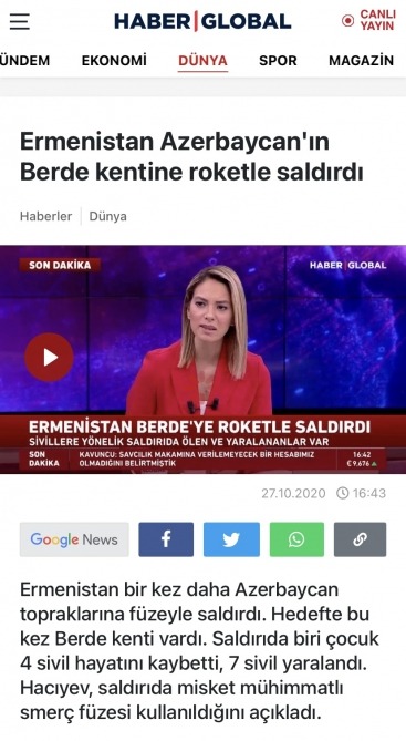 Türkiyənin Anadolu Agentliyi, TRT kanalı, Haber Global, Yeni Şafak, Sözcü və digər media qurumları tərəfindən yayımlanan xəbərlər və reportajlarda oktyabrın 27-də axşam saatlarında Ermənistanın Bərdə şəhərinə raket zərbələri endirməsi və dinc sakinlərin, eləcə də uşaqların həlak olması, yaralanması haqqında məlumatlar yer alıb.