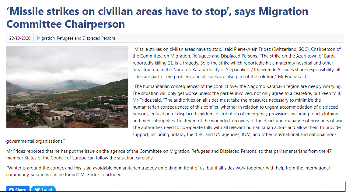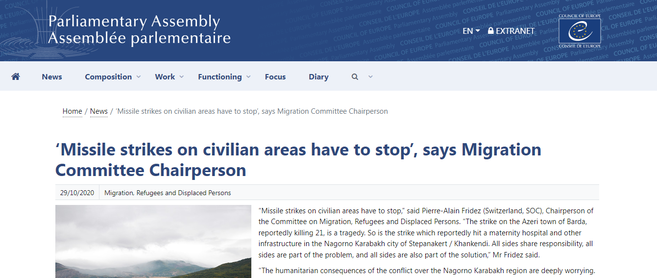 “Mülki yaşayış məntəqələrinə raket zərbələri dayandırılmalıdır. Azərbaycanın Bərdə şəhərinə zərbələrin endirilməsi, 21 nəfərin həlak olması fəlakətdir”, - deyən komitə sədri Piyer Alan Fridez münaqişənin humanitar nəticələrindən dərin narahatlığını bildirib. O, vəziyyətin Avropa Şurasının 47 üzv dövlətini təmsil edən parlamentarilər tərəfindən diqqətlə izlənilməsi üçün məsələni rəhbərlik etdiyi komitənin gündəliyinə saldığını bildirib.