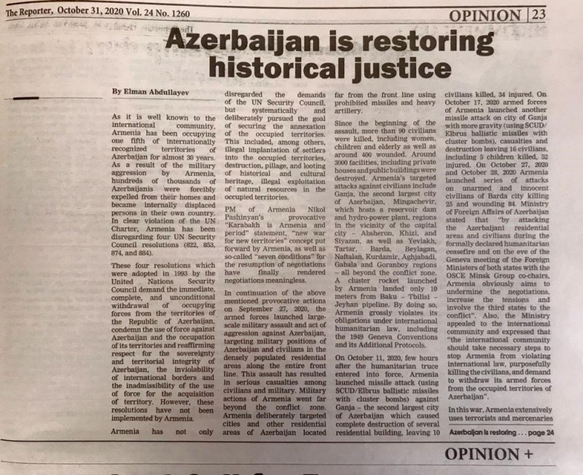 Efiopiyanın aparıcı və ən geniş oxucu kütləsinə malik olan “Reporter” qəzetində Azərbaycanın Efiopiyadakı səfiri Elman Abdullayevin “Azərbaycan tarixi ədaləti bərpa edir” adlı məqaləsi dərc edilib.