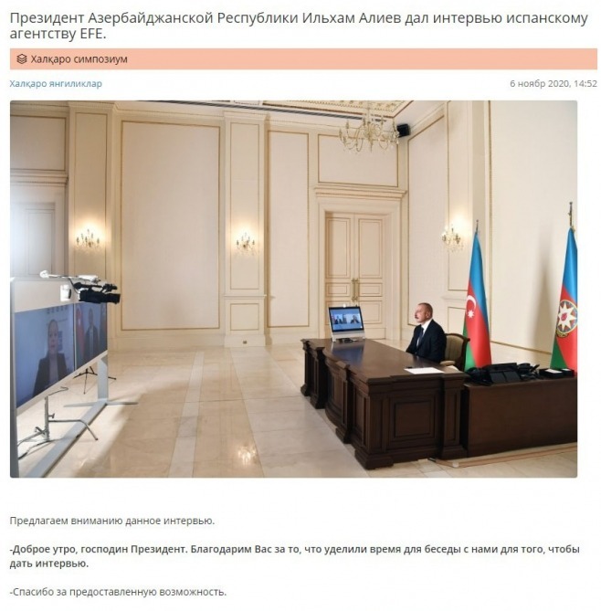 Özbəkistanın “fikr.uz” portalı Azərbaycan Prezidenti İlham Əliyevin İspaniyanın EFE informasiya agentliyinə müsahibəsini rus dilində tam olaraq dərc edib.