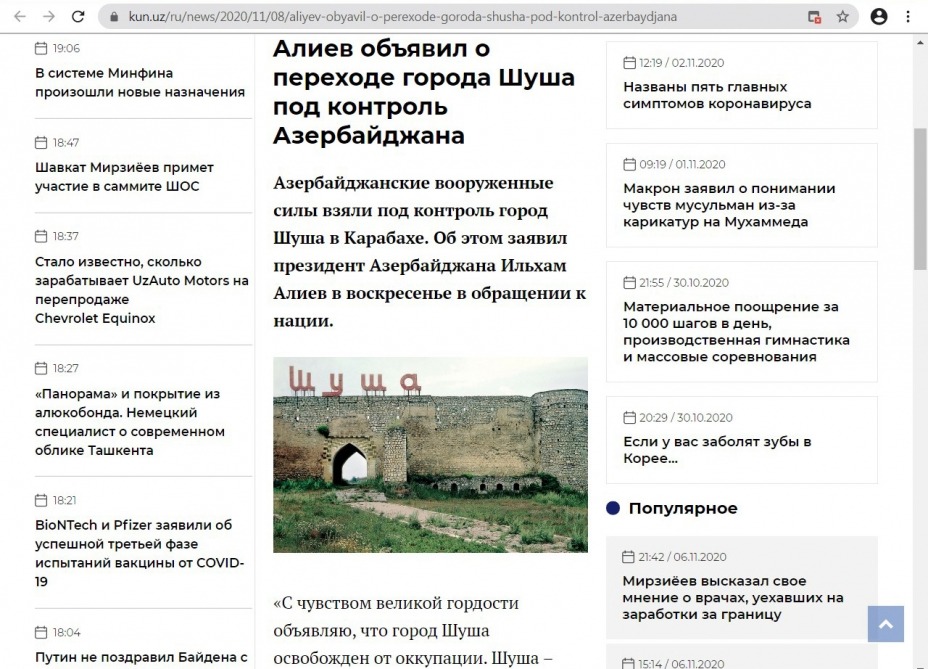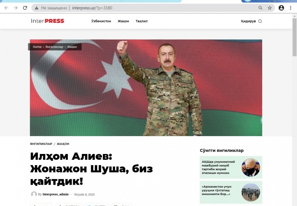 Özbəkistanın “kun.uz”, “Interpress.uz”, “omma.uz”, “xabar.uz”, “daryo.uz” portalları Şuşanın işğaldan azad olunması ilə bağlı özbək və rus dillərində məqalələr yayıb.