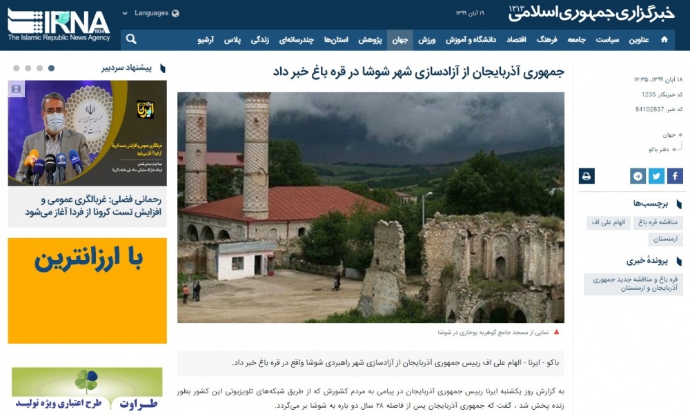 İranın “Tasnim news”, İRNA, “Entekhab”, “Fararu”, “Borna news”, “Khabaronline” saytları Prezident İlham Əliyevin xalqa müraciətinə istinad edərək, Şuşa şəhərinin Azərbaycan Ordusu tərəfindən azad edildiyini bildirib.