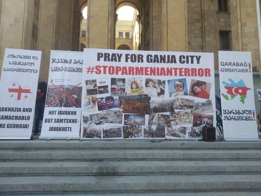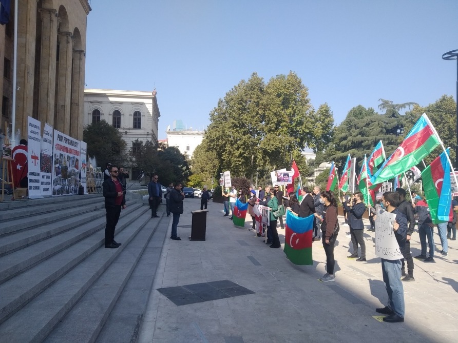 Tbilisidə, Gürcüstan parlamentinin qarşısında keçirilən aksiyada erməni terroru kəskin pislənilib, “Qarabağ Azərbaycandır?”, “Şəhidlər ölməz, Vətən bölünməz!”, “Yaşasın Azərbaycan Ordusu!”, “Yaşasın Azərbaycan-Gürcüstan qardaşlığı!” və s. şüarlar səsləndirilib.