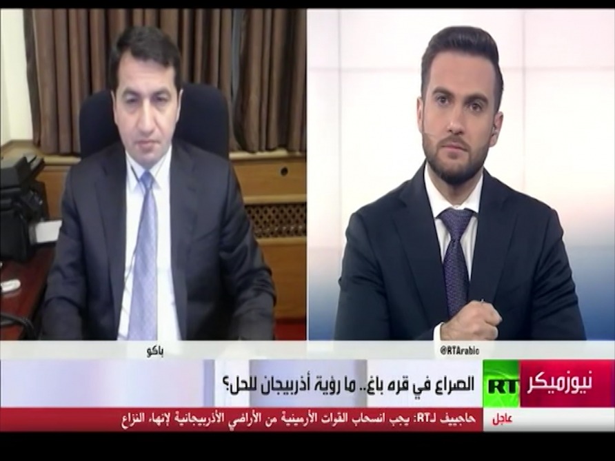 Azərbaycan Respublikası Prezidentinin köməkçisi - Prezident Administrasiyasının Xarici siyasət məsələləri şöbəsinin müdiri Hikmət Hacıyev “Russia Today Arabic” kanalına müsahibə verib.