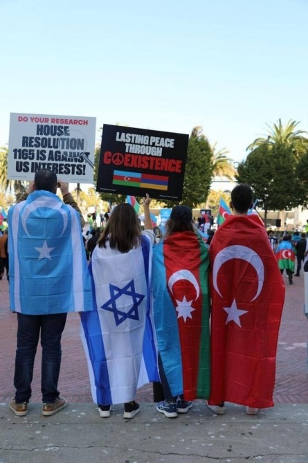 Eyni zamanda, Azərbaycan icma üzvləri İsrail, Pakistan, Türkiyə və Ukraynanın bayraqlarını qaldıraraq bu ölkələrə Azərbaycanı dəstəkləməsinə görə təşəkkürlərini bildiriblər.