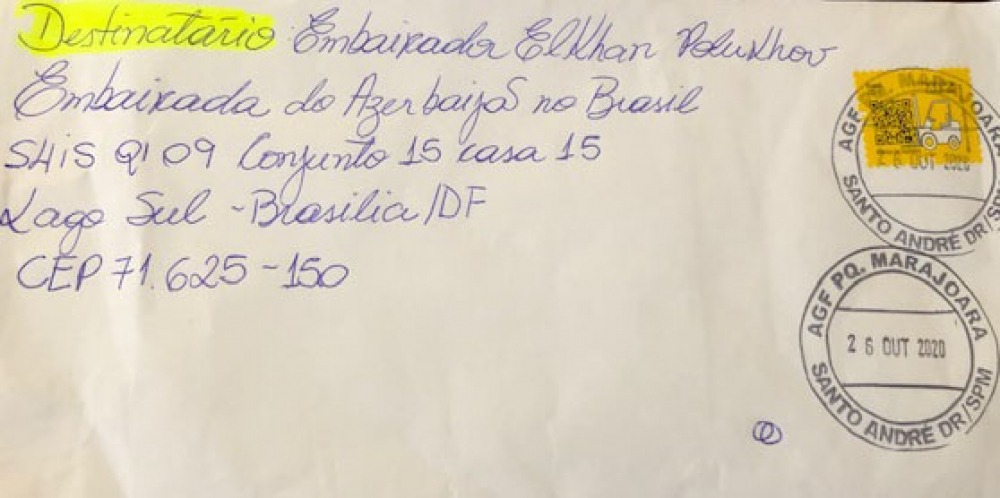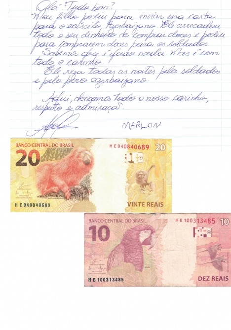 Azərbaycanın Braziliyadakı Səfirliyinə Braziliya vətəndaşı, San Paulo ştatında yaşayan 10 yaşlı Marlon adlı bir gəncdən “Əsgərə məktub” layihəsi çərçivəsində, şanlı Azərbaycan Ordusunun əsgərlərinə ünvanlanmış məktub daxil olub.