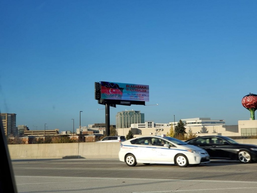 Amerikanın Orta-Qərb ştatları üzrə Azərbaycan Mərkəzinin təşəbbüsü və Diasporla İş üzrə Dövlət Komitəsinin dəstəyi ilə ABŞ-ın Çikaqo ştatının mərkəzi yollarında Azərbaycan bayrağının təsviri ilə “Karabakh is Azerbaijan” şüarı yazılan lövhələr quraşdırılıb. Lövhələrdə ermənilərin mülki azərbaycanlıları hədəfə aldığı da qeyd edilib.