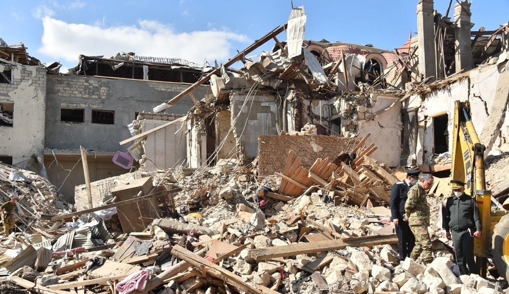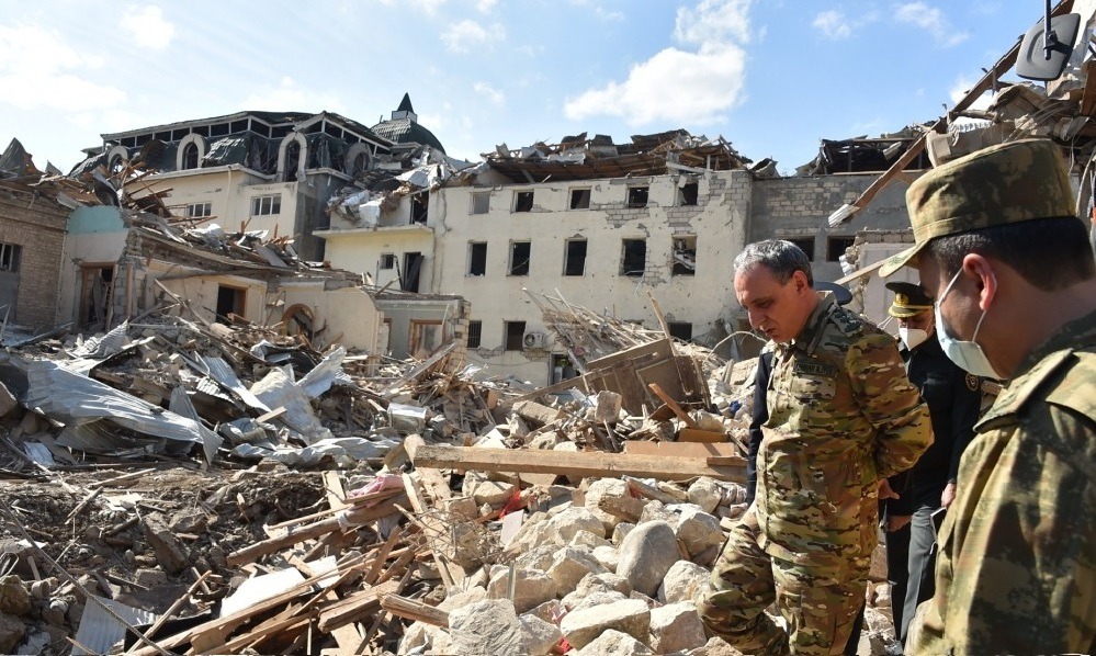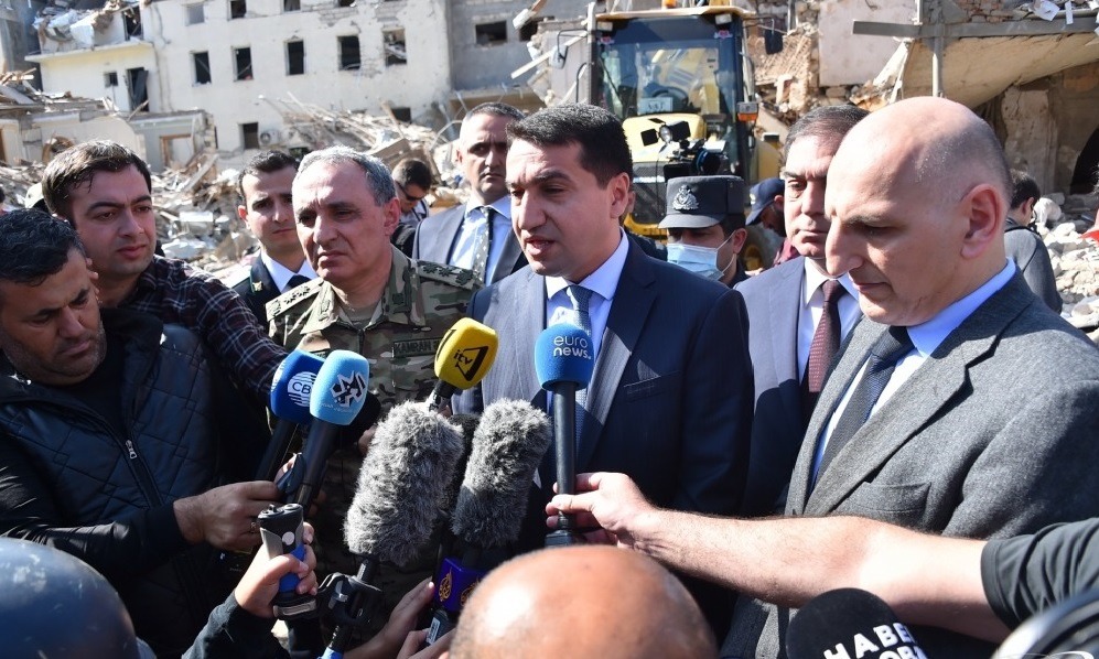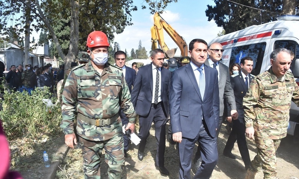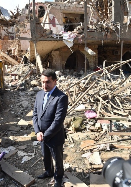 Azərbaycan Respublikası Prezidentinin köməkçisi - Prezident Administrasiyasının Xarici siyasət məsələləri şöbəsinin müdiri Hikmət Hacıyev, Azərbaycan Respublikasının Baş prokuroru Kamran Əliyev və Azərbaycanın Birinci vitse-prezidentinin köməkçisi Elçin Əmirbəyov oktyabrın 11-də Ermənistan silahlı qüvvələrinin Gəncəni raket atəşinə tutması nəticəsində çoxmənzilli yaşayış binasının dağıldığı ərazidə olublar.