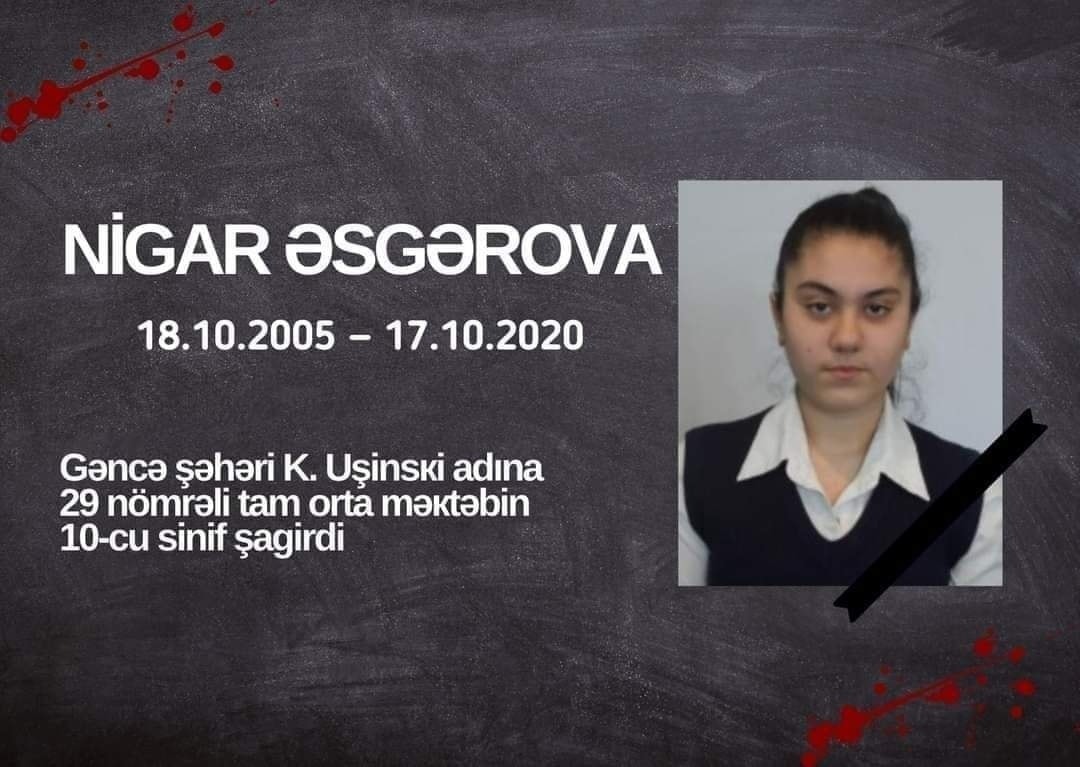 15 yaşlı Nigar Əsgərovanın sabah ad günü olacaqdı. Nigar Gəncə şəhəri 29 nömrəli tam orta məktəbin 10-cu sinfində təhsil alırdı. Bu gecə işğalçı Ermənistanın Gəncəyə raket hücumu nəticəsində evləri başına uçdu və Nigar balamız həlak oldu. Düşmən təcavüzü nəticəsində artıq 4 məktəblimiz həlak olub.