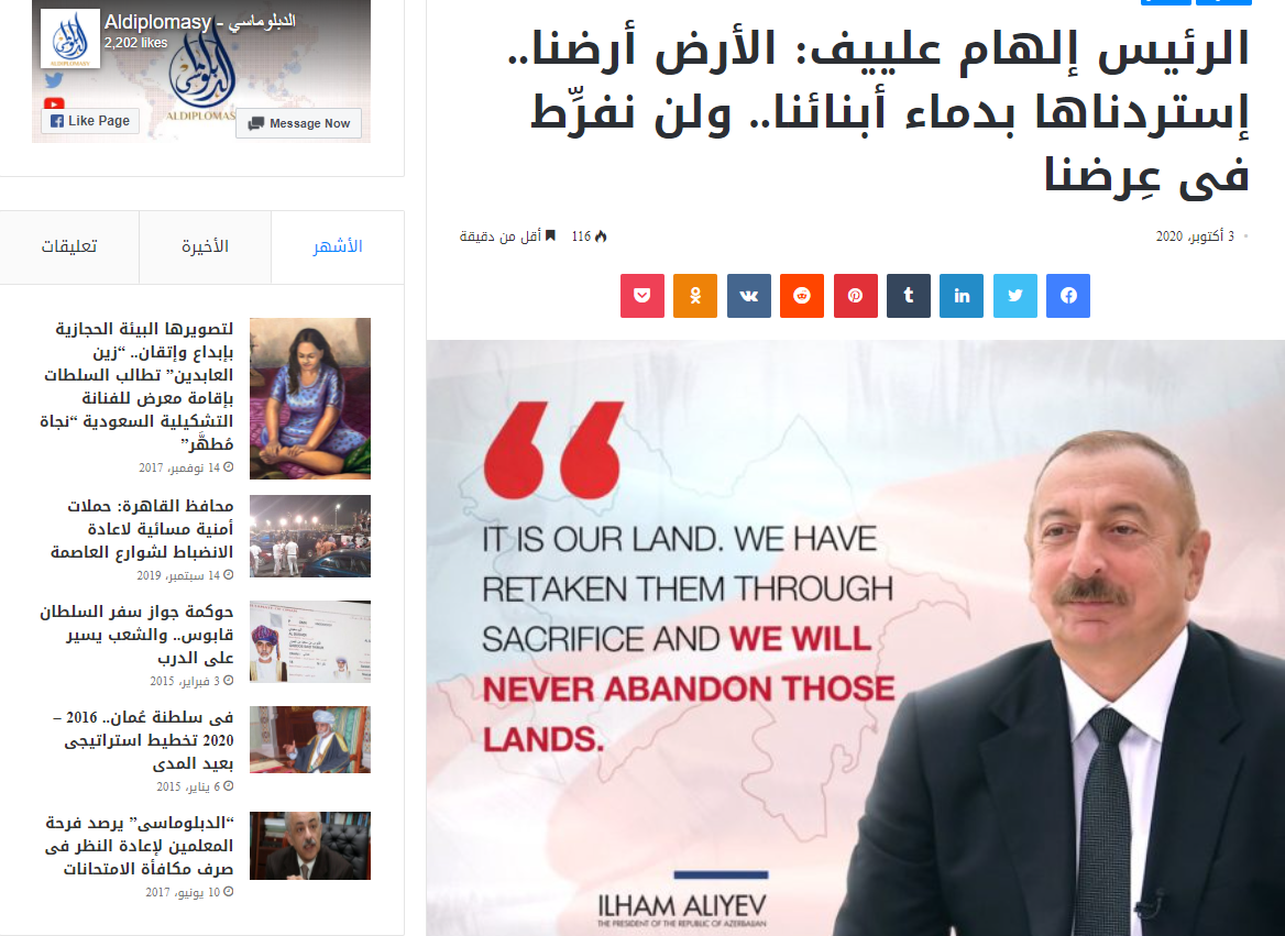 Misirin diplomatik “Aldiplomasy” portalı Azərbaycan Respublikasının Prezidenti İlham Əliyevin özünün rəsmi “Twitter” səhifəsində Azərbaycan Ordusunun Tərtər rayonunun Talış kəndini, Cəbrayıl rayonunun Mehdili, Çaxırlı, Aşağı Maralyan, Şəybəy və Quycaq kəndlərini, Füzuli rayonunun Aşağı Əbdürrəhmanlı kəndini azad etməsi barədə statusunu yayıb.