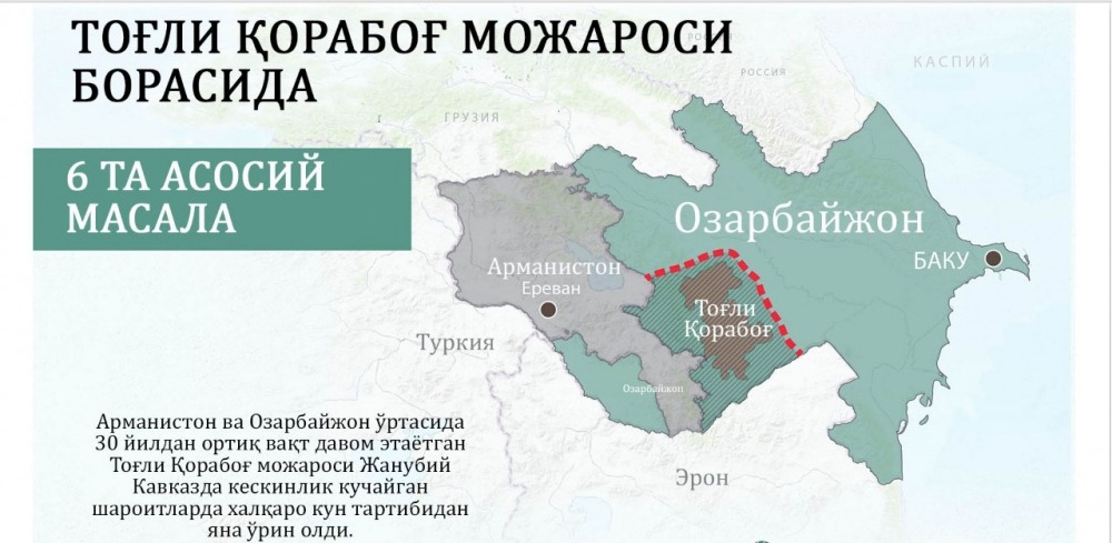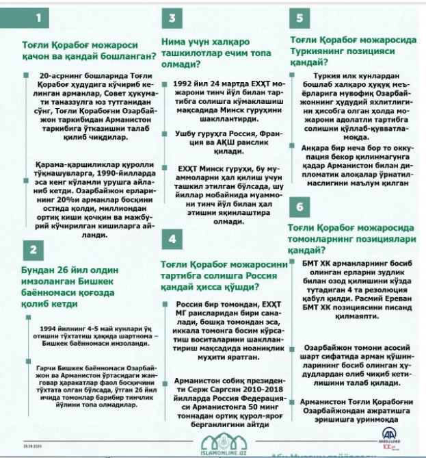 “İslamonline.uz” portalı isə “Dağlıq Qarabağ münaqişəsi haqqında 6 əsas məsələ” sərlövhəli infoqrafika verib. İnfoqrafikada Dağlıq Qarabağın xəritəsi əks olunub. Həmçinin münaqişənin başlanması və tarixi, problemin həllində Türkiyənin mövqeyi, Ermənistan silahlı qüvvələrinin Azərbaycan torpaqlarından qeyd-şərtsiz çıxarılması haqqında BMT Təhlükəsizlik Şurasının 4 qətnaməsinin qəbul edilməsi barədə məlumat verilib.
