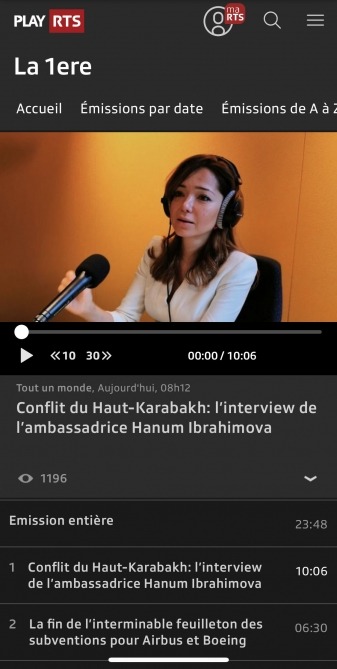 Oktyabrın 16-da Azərbaycanın İsveçrədəki səfiri Xanım İbrahimova milli və beynəlxalq səviyyədə bu ölkənin ən böyük radiosu hesab edilən “RTS”ə Ermənistanın Azərbaycana qarşı təcavüzü və hazırda gedən döyüşlər barədə müsahibə verib. Müsahibə dinləyicilərin radionu ənənəvi olaraq ən çox dinlədiyi “əsas vaxt”ında efirə çıxıb.