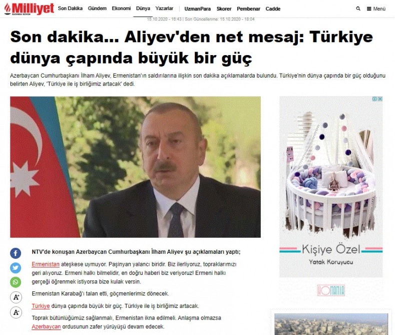 Prezident İlham Əliyevin işğalçı Ermənistan rəhbərliyinə və dünya ictimaiyyətinə ünvanlandığı mesajlar Türkiyə mediası və ictimaiyyəti tərəfindən sonsuz maraqla qarşılanır.