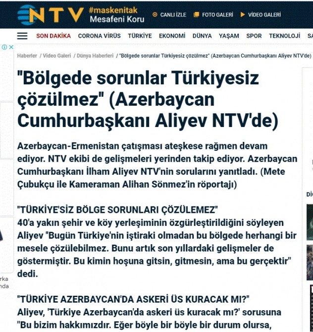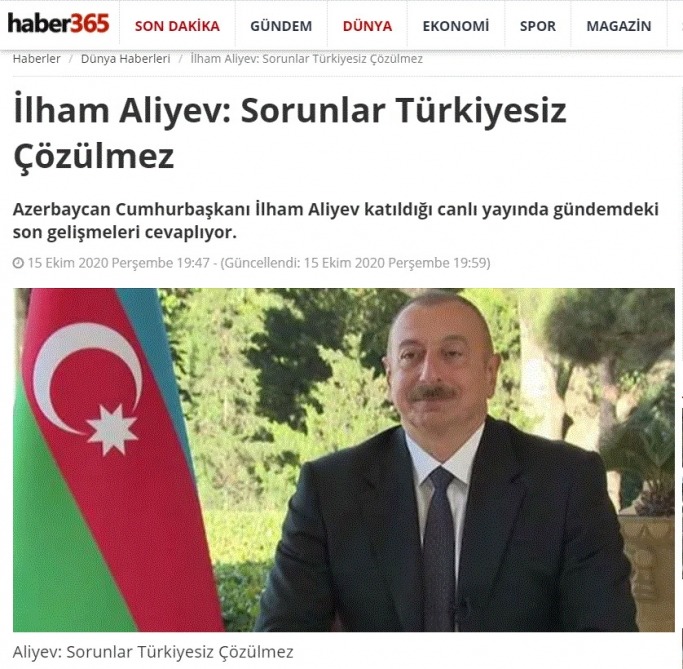 Türkiyə kütləvi informasiya vasitələri Prezident İlham Əliyevin fəaliyyətinin işıqlandırılmasına geniş yer ayırır. Dövlətimizin başçısının müsahibələri, eləcə də ordumuzun rəşadəti barədə fikirləri, Ali Baş Komandanımızın cəbhədəki qələbələrə dair paylaşdığı yeni məlumatlar bir an içərisində Türkiyə KİV-lərinin ana xəbəri kimi qalmaqdadır.