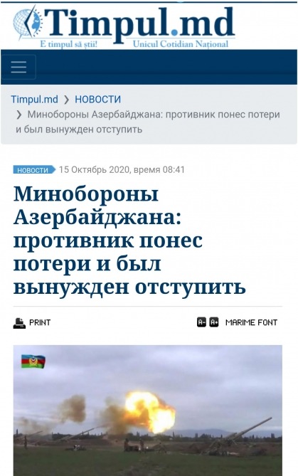 Moldovanın “Timpul.md”, “NOİ.md”, “AVA.md” və digər informasiya portallarında Ermənistanın Azərbaycanın mülki əhalisini atəşə tutması, böyük şəhərlərimizin raket atəşinə tutulması, regional neft boru xətlərimizi hədəfə alması və bu kimi müharibə cinayətlərindən bəhs edilib.