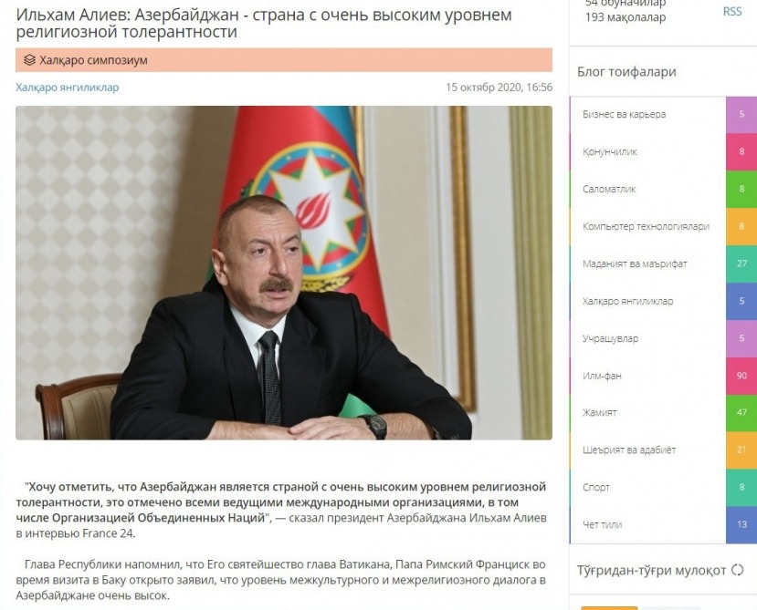“tnews.uz” portalı Azərbaycan Prezidenti İlham Əliyevin “France 24” televiziya kanalına müsahibəsinin tam mətnini verib. “fikr.uz” saytı isə bu müsahibə ilə əlaqədar analitik məqalə dərc edib. Məqalədə müsahibədən sitat gətirilir: “Onu qeyd etmək istəyirəm ki, Azərbaycan dini tolerantlıq səviyyəsi çox yüksək olan bir ölkədir və bu, bütün aparıcı beynəlxalq təşkilatlar, o cümlədən Birləşmiş Millətlər Təşkilatı tərəfindən qeyd olunmuşdur. Zati-müqəddəsləri, Vatikanın rəhbəri, Roma Papası Fransisk Bakıya səfəri zamanı açıq şəkildə demişdir ki, Azərbaycanda mədəniyyətlərarası və dinlərarası dialoqun səviyyəsi çox yüksəkdir”.