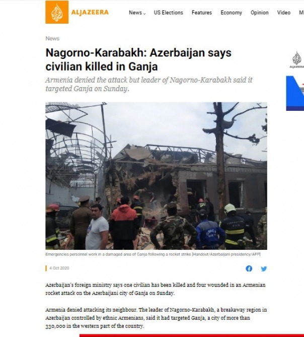 Ərəb ölkələrinin nüfuzlu KİV-ləri – Qətərin “Aljazeera” televiziya kanalı və Misirin “Al Ahram” qəzeti Azərbaycanın ikinci böyük şəhəri Gəncədə mülki obyektlərin, o cümlədən yaşayış binalarının ermənilər tərəfindən artilleriya atəşinə tutulması, dinc əhali arasında ölən və yaralananların olması barədə xəbərlər yayıblar.