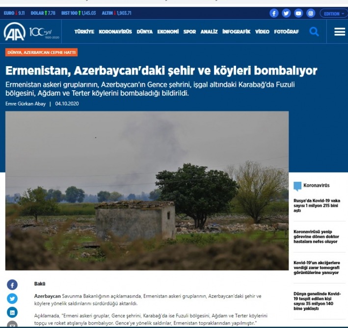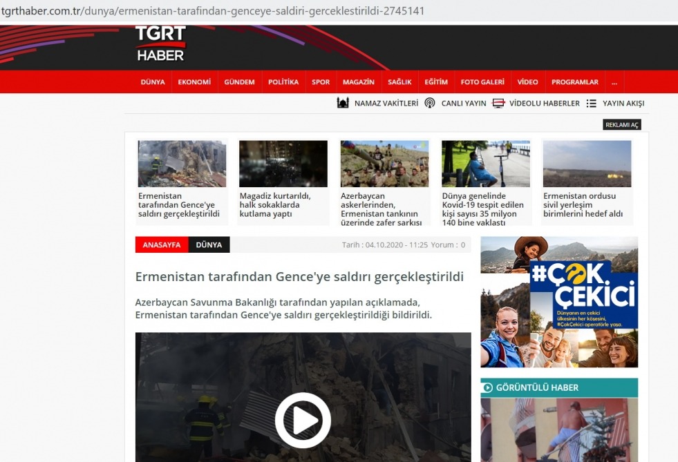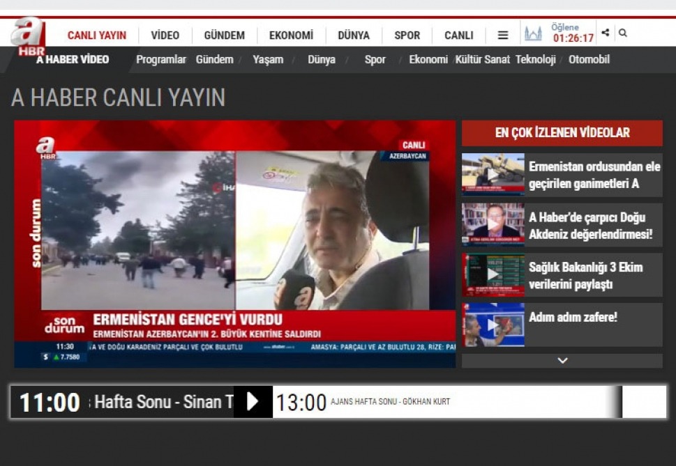 Azərbaycanın Gəncə şəhərinin Ermənistan ərazisindən raket atəşinə tutulması xəbəri Türkiyənin aparıcı kütləvi informasiya vasitələri tərəfindən sürətlə yayılıb.