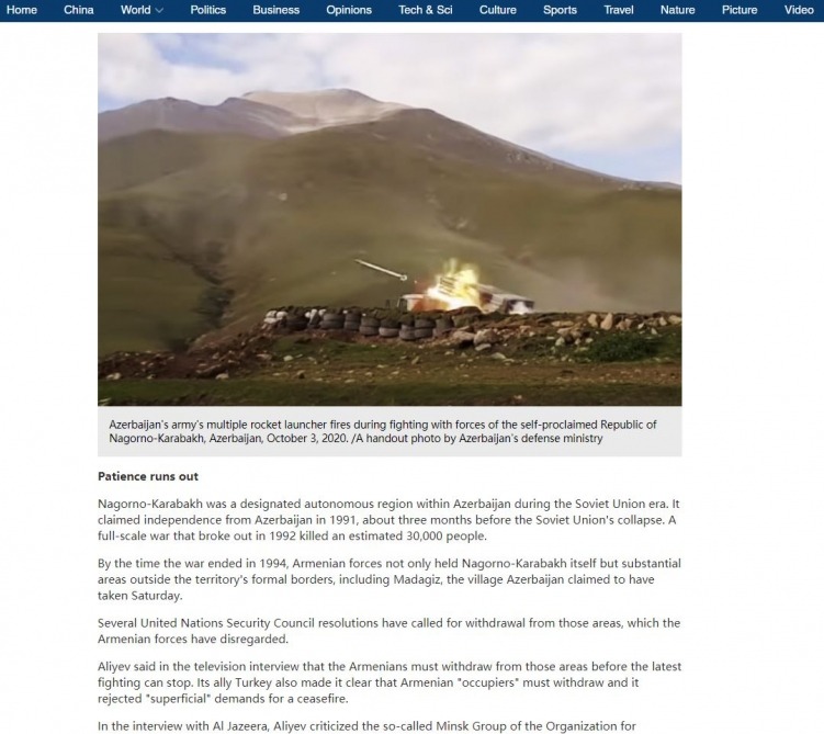 Çin Mərkəzi Televiziyasının ingilis dilində yayımlanan CGTN (China Global Television Network) kanalının internet səhifəsində Gəncə şəhərinin Ermənistan tərəfindən atəşə tutulması barədə xəbər yerləşdirilib.