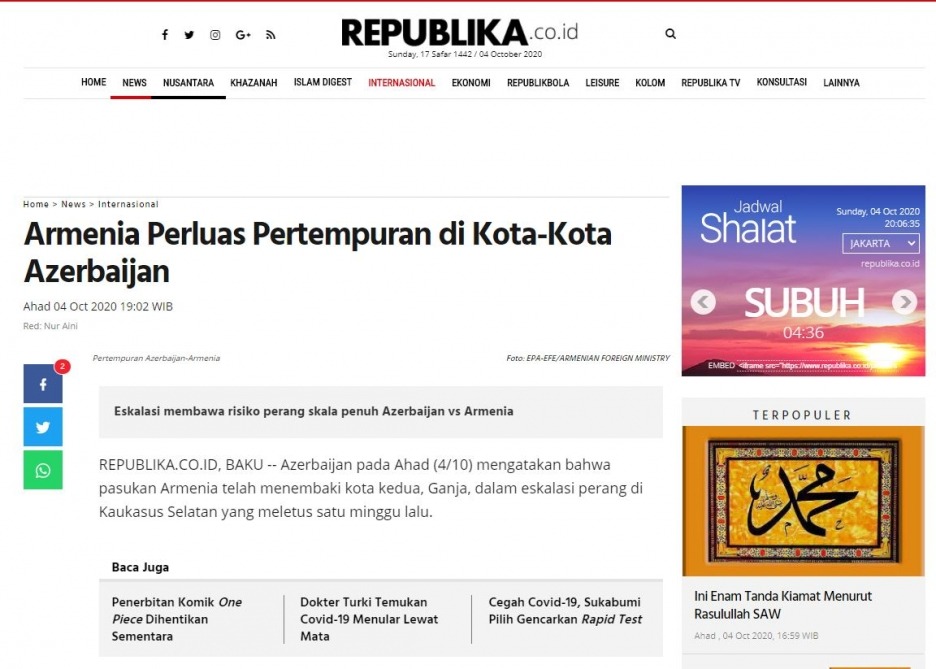 Məqalələrdə Azərbaycanın Müdafiə naziri Zakir Həsənovun sözləri də sitat gətirilib: “Ermənistanın Azərbaycan ərazilərinə hücumu açıq-aşkar təxribatdır və münaqişənin ərazisinin genişlənməsinə xidmət edir”.