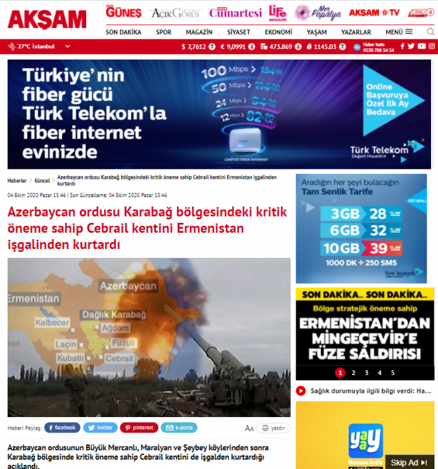 Hazırda ölkənin aparıcı telekanallarında cəbhə xəttindəki vəziyyət ekspertlər tərəfindən qızğın müzakirə olunur, Cəbrayıl şəhərinin işğaldan azad olunmasının strateji əhəmiyyəti təhlil edilir.