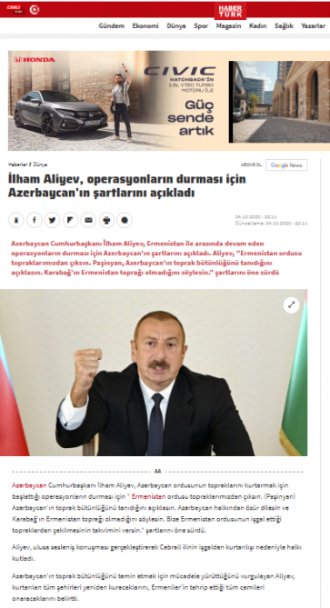 Azərbaycan Silahlı Qüvvələrinin Ermənistanın işğalı altında olan Cəbrayıl şəhərini və ətraf kəndləri düşməndən azad etməsi Türkiyənin bütün kütləvi informasiya vasitələri tərəfindən geniş işıqlandırılıb. Əvvəlcə Prezident İlham Əliyevin sosial şəbəkə paylaşımlarına istinad edən media orqanları sonrakı mərhələdə xəbəri dövlətimizin başçısının canlı yayımla Azərbaycan xalqına müraciəti əsasında yayıblar.