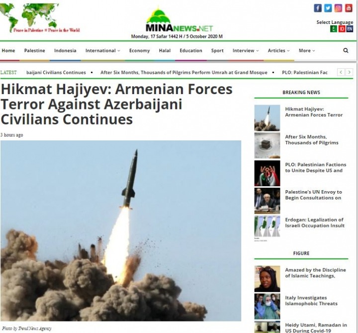 Azərbaycanın Dağlıq Qarabağ bölgəsində davam edən döyüşlərlə əlaqədar həmin saytlarda dərc edilən məlumatlarda Prezident köməkçisinin aşağıdakı sözləri də sitat kimi yer alıb: “Ermənistan silahlı qüvvələri Azərbaycanın Mingəçevir sənaye şəhərinə qarşı raket hücumu təşkil edib. Mingəçevirdə su anbarı və əsas elektrik stansiyası mövcuddur. Çarəsizliyin barbar ifadəsi”.