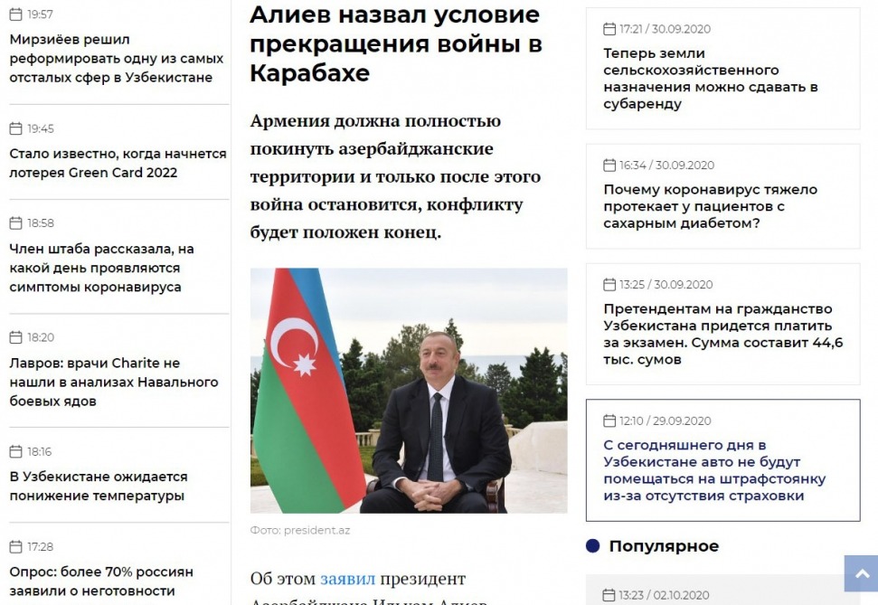 Kun.uz portalı “İlham Əliyev müharibənin dayandırılması şərtlərini elan edib” sərlövhəli məqaləsində Azərbaycan Prezidentinin “Əl-Ərəbiyə” telekanalına müsahibəsindən sitatlar verib.