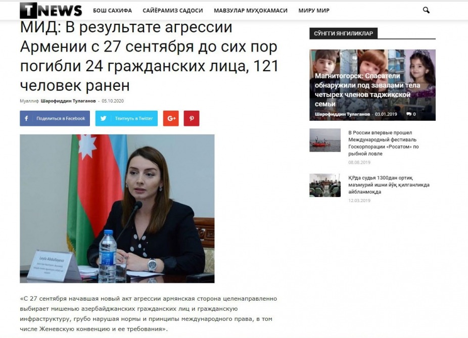 Tnews.uz portalı Azərbaycanın əks-hücumları ilə bağlı Xarici İşlər Nazirliyinin Mətbuat xidməti idarəsinin rəisi Leyla Abdullayevanın fikirlərinə yer ayırıb.