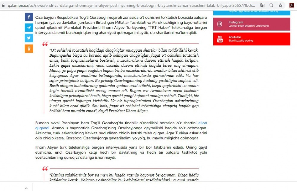 Özbəkistanın “qalampir.uz” xəbər portalı Azərbaycan Prezidenti İlham Əliyevin Türkiyənin “TRT Haber” televiziya kanalına müsahibəsi ilə bağlı özbək dilində iki məqalə dərc edib.