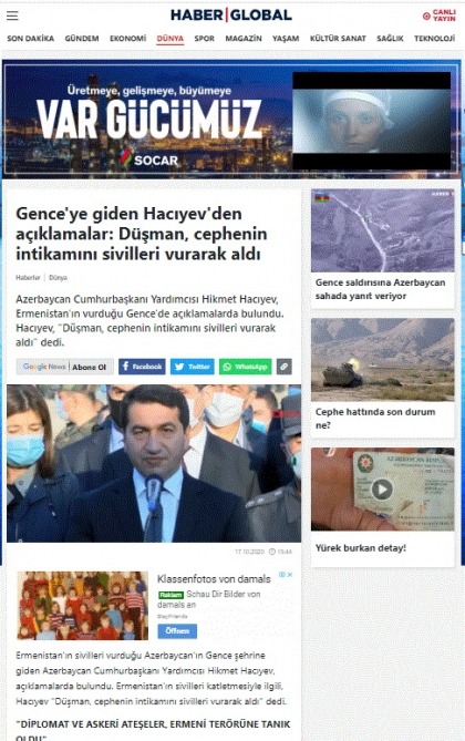 Qeyd edək ki, Türkiyənin aparıcı telekanalları, informasiya agentlikləri və qəzetlər, o cümlədən regionla xəbər portalları və digər media quruluşları fasiləsiz olaraq Azərbaycan həqiqətləri ilə bağlı məlumatları, eləcə də Gəncəyə qarşı xain erməni hücumu barədə xəbərləri paylaşırlar.