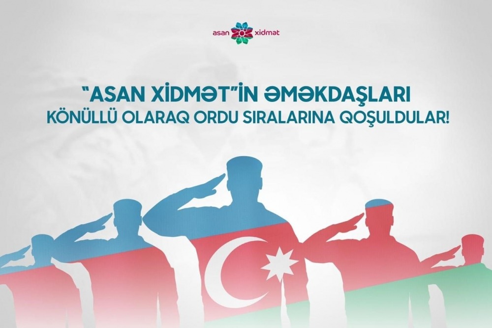 Azərbaycan Respublikasının ərazi bütövlüyü uğrunda gedən döyüşlərdə iştirak etmək üçün müraciət etmiş “ASAN xidmət”in yüzlərlə əməkdaşından 36 nəfəri könüllü olaraq ordu sıralarına qoşulub.