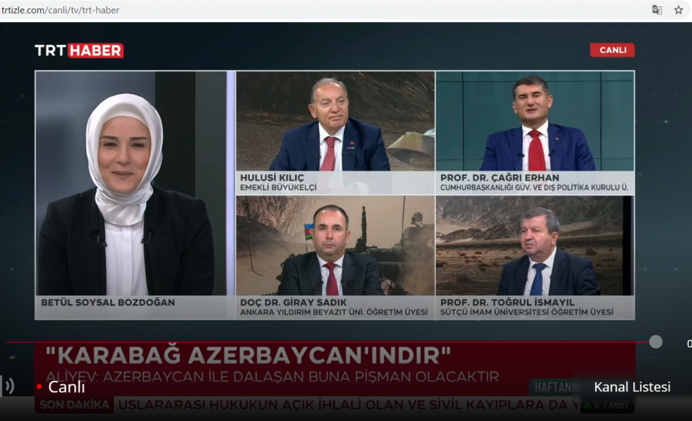 The guests analyzed the tension in different directions. The Turkish-speaking audience was thoroughly informed about President Ilham Aliyev’s appeal to the Azerbaijani people, the telephone conversations held between the presidents of Azerbaijan and Turkey, the statements made by Azerbaijan’s Presidential Administration and Defense Ministry, the causes and goals of the aggressor’s attacks, Armenia’s shelling of civilians, the world community’s reaction to the conflict escalation and other important issues.