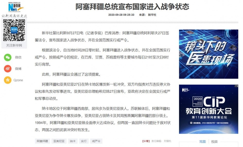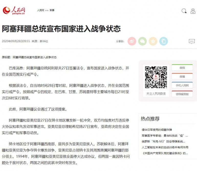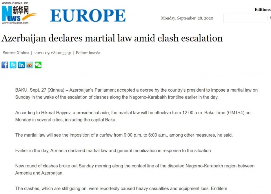 The Chinese media outlets also reported that Azerbaijani President Ilham Aliyev declared martial law in the country. They also highlighted the statement made by UN Secretary General Antonio Guterres, the phone conversation Russia’s foreign minister held with his Azerbaijani, Armenian and Turkish counterparts.