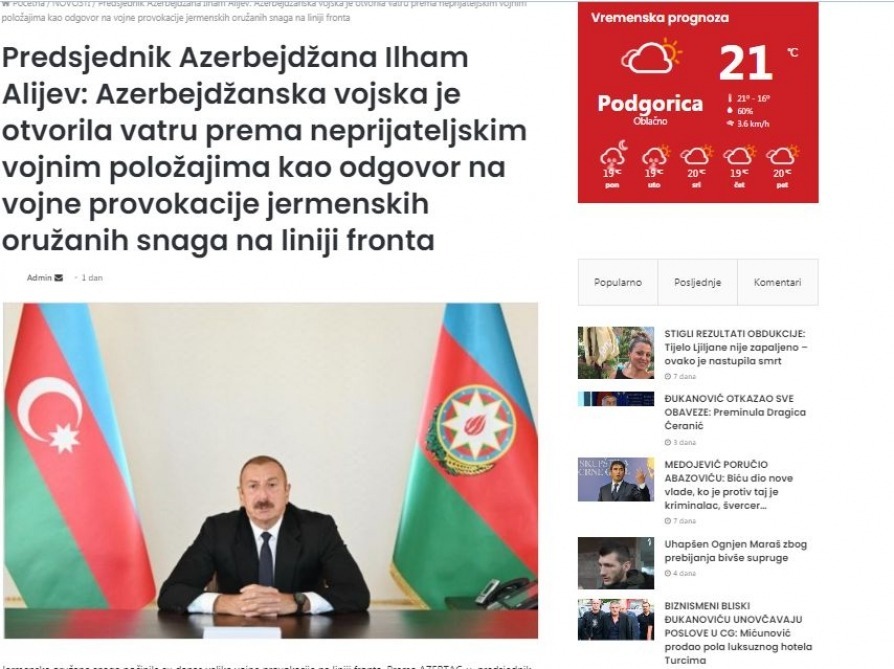 Volim Podgoricu, an influential Montenegrin news portal, has published an article headlined “Azerbaijani President Ilham Aliyev: Azerbaijani Army opened fire at Armenia’s military positions in response to the enemy’s provocations along the frontline”.