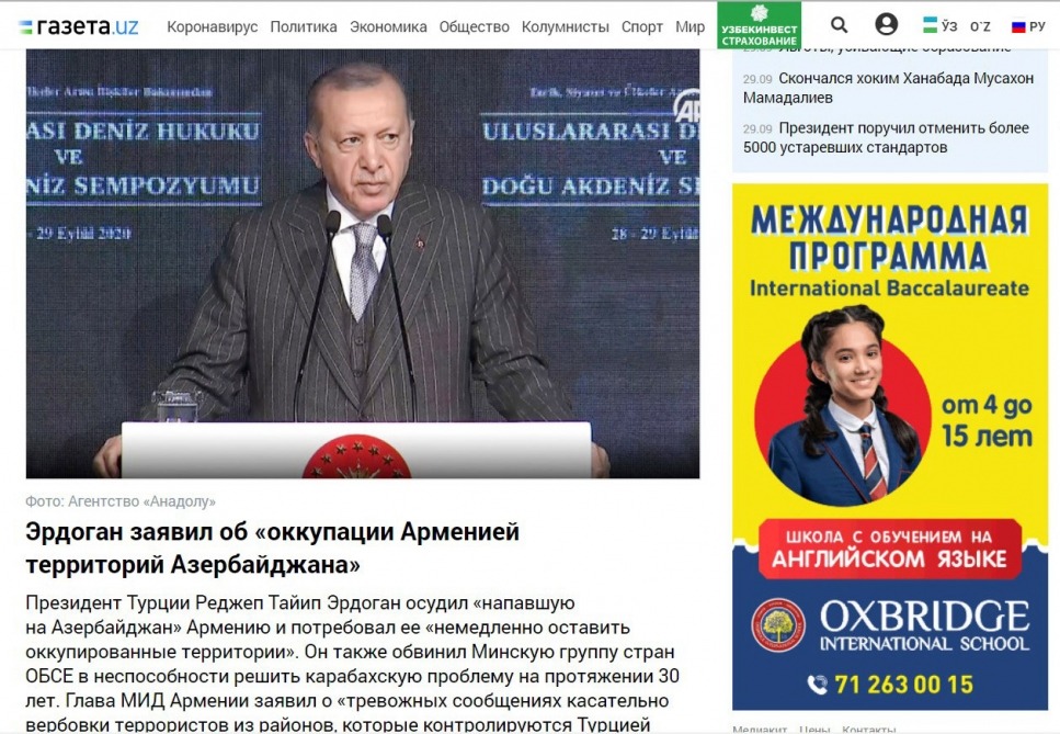 Daryo.uz portal highlighted Turkish President Recep Tayyip Erdogan’s call for the withdrawal of Armenian troops from the Azerbaijani territories. The portal, citing the Turkish Hurriyet newspaper, said President Erdogan stated that the OSCE Minsk Group is not capable of solving the Nagorno-Karabakh problem.