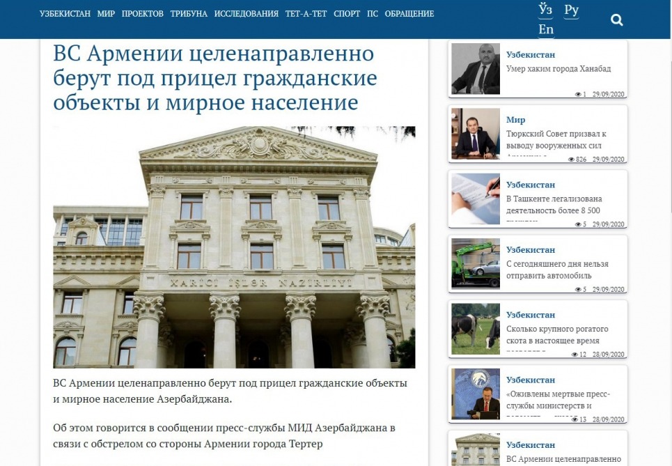 Uzbek fikr.uz portal highlighted the appeal made by President of Azerbaijan Ilham Aliyev to the nation. The portal skun.uz, human.uz, daryo.uz published articles on the war crimes committed by Armenia in the Azerbaijani lands.