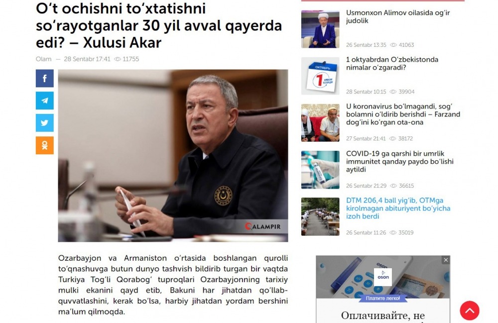 Qalampir.uz portal covered the remarks voiced by Turkish National Defense Minister Hulusi Akar regarding the Azerbaijani Army’s counteroffensive operations in Nagorno-Karabakh. “When Armenia’s provocations against Azerbaijan are given a worthy response, calls are made to stop the counteroffensive. Those who immediately call for a ceasefire, what were you thinking when the Armenians killed the residents of Khojaly?”