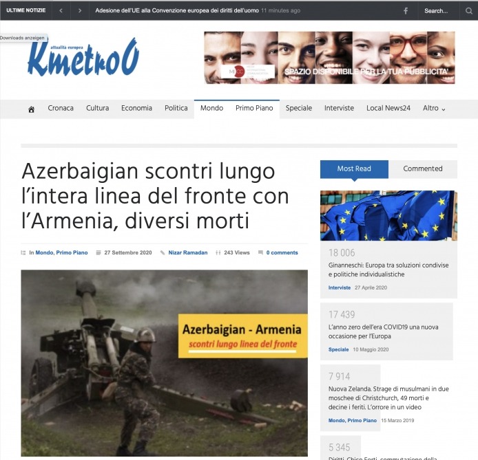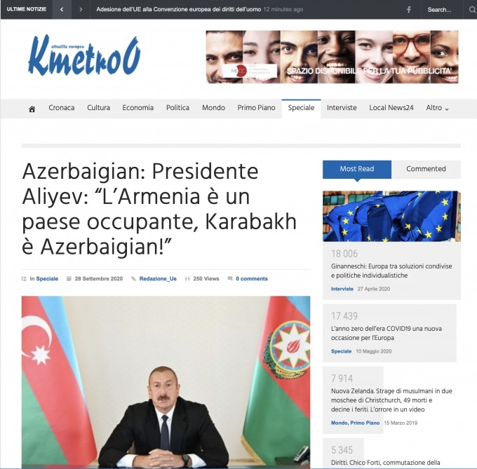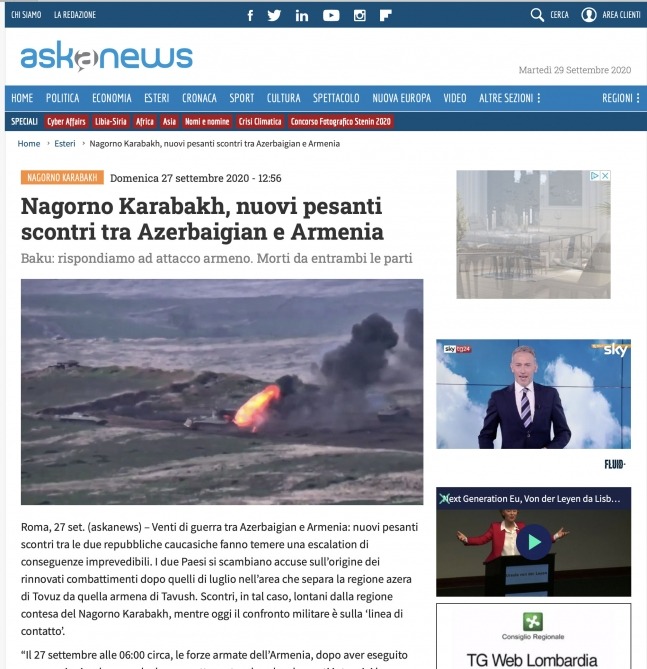 Italian media outlets – Kmetro, Il Tempo, Politicamente Corretto, Libero Quotidiano, Agenzia Nova, Askanews, Notizie Yahoo, Fortuneita, Maximitalia, Agenzia Stampa Italia, Adnkronos, Radioveronicaone, “Sardegnagol, Notizie Geopolitiche – widely covered the provocations committed by Armenian armed forces against Azerbaijan on September 27.