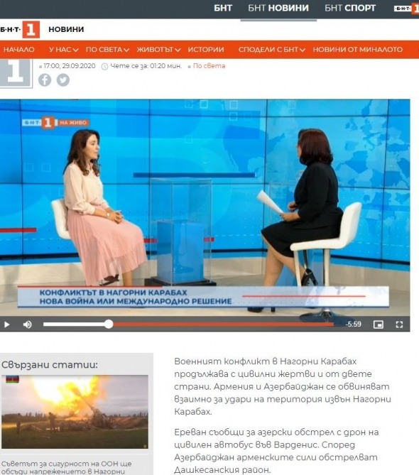 Azerbaijani Ambassador to Bulgaria Nargiz Gurbanova gave an interview during the “The World and We” program aired on the Bulgarian National Television's (BNT). The interview was also published on the TV channel’s website.