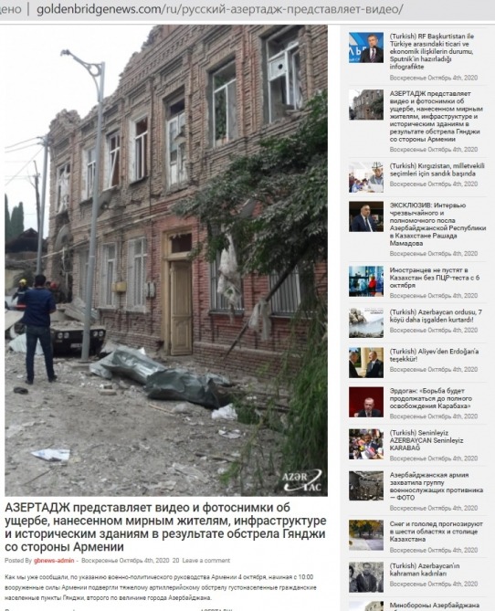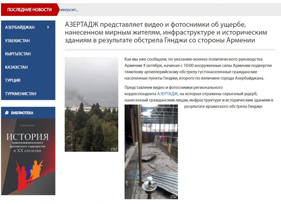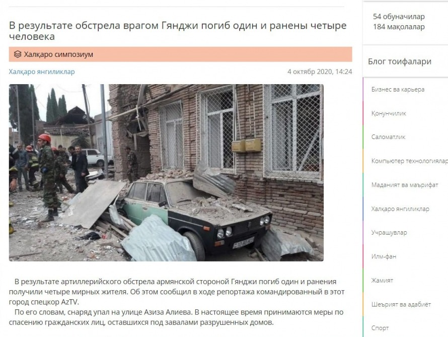 The Kyrgyz media portals ‘goldenbridgenews.com’ and ‘turktoday.info’ have published articles about the damage caused to civilians, infrastructure and historical buildings as a result of the shelling of Ganja city by Armenia. Another publication dedicated to the shelling of Ganja city has been published on ‘fikr.uz’ website of Uzbekistan.